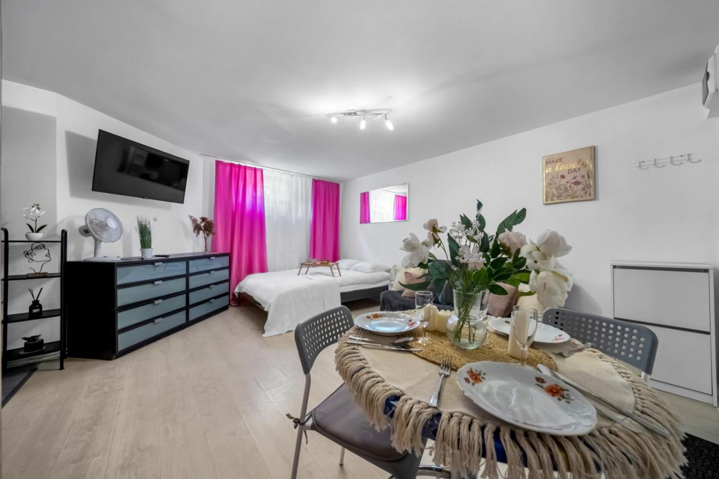Apartament typu studio z łóżkiem typu queen-size. Boasting a private entrance, this apartment also comes with 1 bedroom, a seating area and 1 bathroom with a shower and a hairdryer. In the well-fitted kitchen, guests will find a stovetop, a refrigerator, a dishwasher and kitchenware. This apartment has a washing machine, a coffee machine, flat-screen TV with streaming services, as well as chocolate for guests. The unit has 2 beds. Apartament - 4 osobowy. Powierzchnia pokoju ok.: 30 mkw.